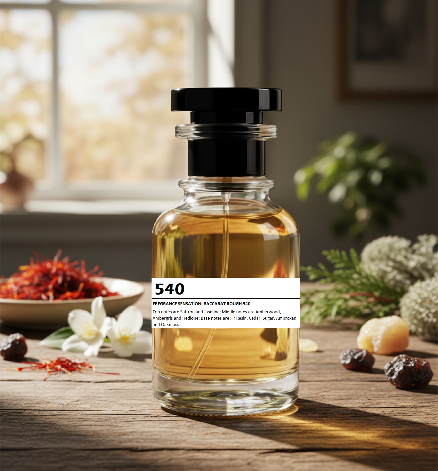 540 is a sophisticated fragrance that opens with luxurious top notes of saffron and jasmine, creating an elegant and inviting introduction. The heart reveals a complex blend of amberwood, ambergris, and headione, adding depth and a subtle marine freshness to the scent. This composition settles into a rich base featuring fir resin, cedar, sugar, ambroxan, and oakmoss, delivering a warm, woody, and slightly sweet dry-down. Meticulously crafted, 540 balances aromatic richness and smoothness, offering an expert-level scent experience perfect for those who appreciate refined and enduring fragrances.