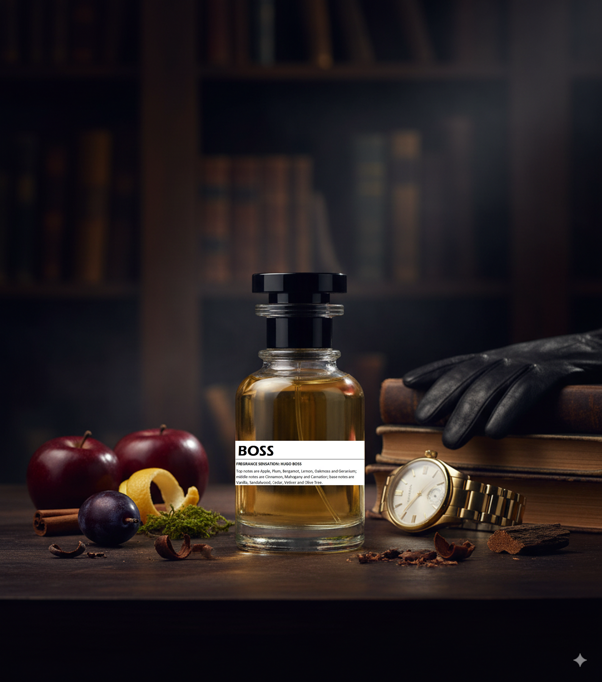 BOSS is a sophisticated fragrance that opens with a fresh and vibrant blend of apple, plum, bergamot, lemon, oak, and geranium, creating an invigorating first impression. At its heart, warm and spicy notes of cinnamon, mahogany, and carnation add depth and complexity, enhancing its refined character. The base features a rich and enduring combination of vanilla, sandalwood, cedar, vetiver, and olive tree, providing a smooth and earthy foundation. This carefully crafted composition balances freshness with warmth, making it an excellent choice for those who appreciate a well-rounded, elegant scent.