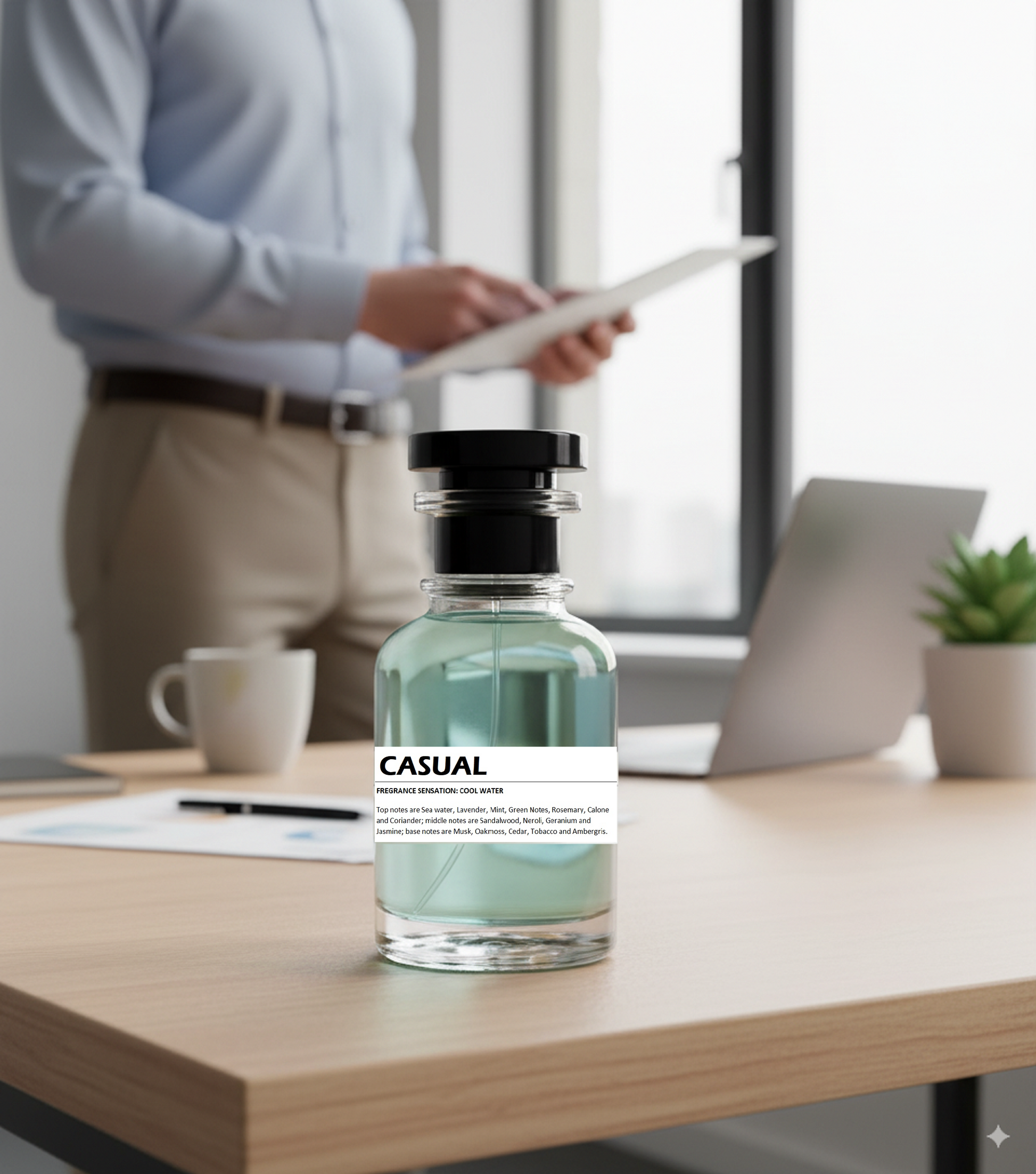 Experience the sophisticated blend of CASUAL, a fragrance designed to evoke freshness and depth. The top notes combine seawater, lavender, mint, green accords, rosemary, calone, and coriander, creating an invigorating and crisp opening that captures the essence of a breezy coastal atmosphere. At its heart, this scent unfolds into a harmonious bouquet of sandalwood, neroli, geranium, and jasmine, providing a balanced floral and woody character that adds complexity and elegance. The base notes ground the fragrance with warm and earthy tones of musk, oakmoss, cedar, tobacco, and ambergris, delivering a lasting, refined finish. Perfect for daily wear, CASUAL offers a versatile and timeless aroma suited to confident, modern individuals.