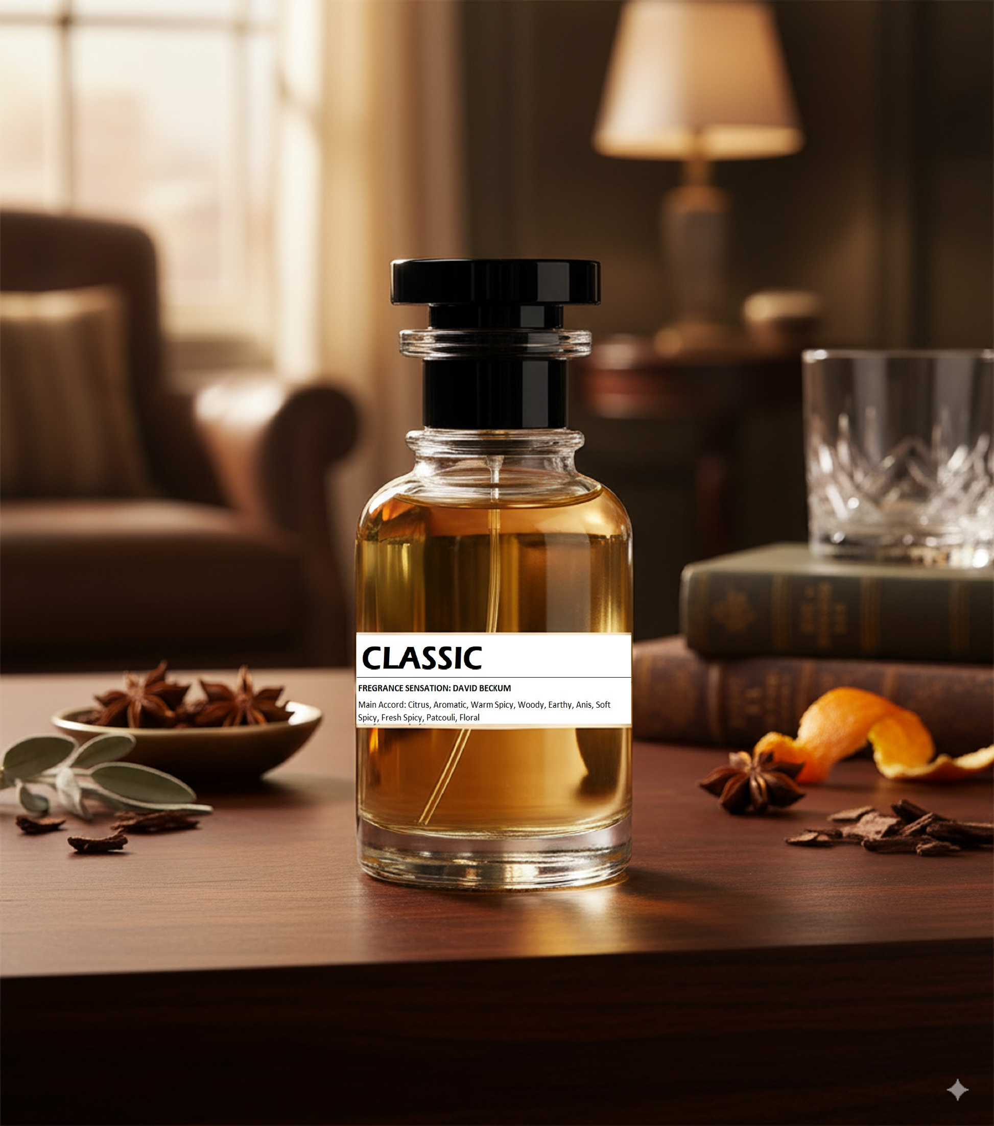 CLASSIC is a refined fragrance that unfolds with a vibrant citrus opening, enhanced by aromatic green notes that energize the senses. Its heart reveals a balanced blend of warm and fresh spicy accords, including nuanced hints of anis and soft, invigorating spices. The base tempers the composition with earthy, woody, and patchouli facets, creating a sophisticated and long-lasting scent. Designed for those who appreciate complexity and elegance, this fragrance delivers a distinctive presence that evolves beautifully throughout the day, making it an expert choice for both casual and formal occasions.