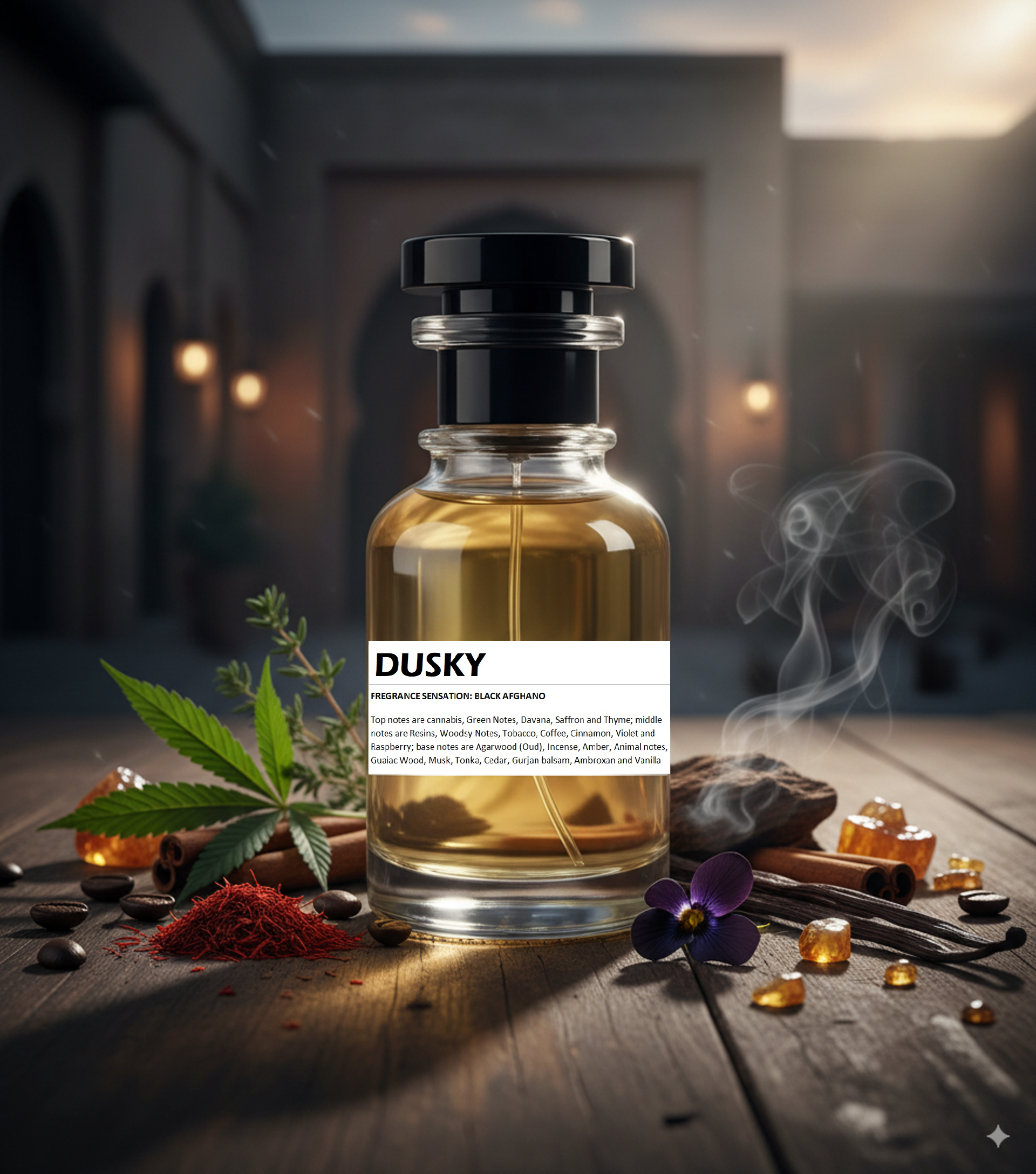 Dusky opens with an intricate blend of cannabis, fresh green notes, davana, saffron, and thyme, creating an aromatic introduction that is both invigorating and unique. The heart reveals a complex fusion of rich resins, woody accords, tobacco, laurel, cinnamon, violet, and raspberry, providing a deep, multifaceted character. Anchoring the fragrance are luxurious base notes of agarwood (oud), incense, amber, animalic hints, guaiac wood, musk, tonka bean, cedar, gurjan balsam, ambroxan, and vanilla, which combine to deliver a warm, enduring finish. This expert composition balances freshness with opulence, making Dusky a distinctive scent for the discerning individual.