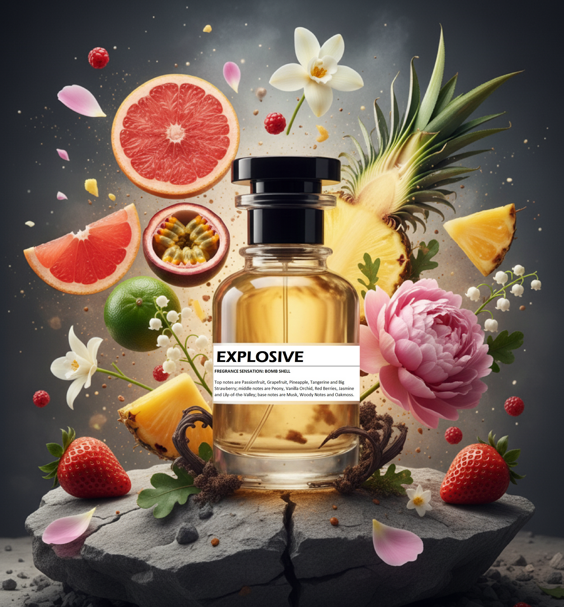 EXPLOSIVE opens with vibrant top notes of passionfruit, grapefruit, pineapple, tangerine, and a bold splash of big strawberry, creating an immediate burst of fruity freshness. The heart reveals a refined floral bouquet combining peony, vanilla orchid, red berries, jasmine, and delicate lily-of-the-valley, offering a rich and harmonious complexity. This exquisite blend gracefully settles into a warm, sensual base of musk, woody notes, and oakmoss, providing lasting depth and sophistication. Designed for those who appreciate a layered and dynamic fragrance, EXPLOSIVE balances lively fruitiness with elegant florals and earthy undertones for a truly captivating scent experience.
